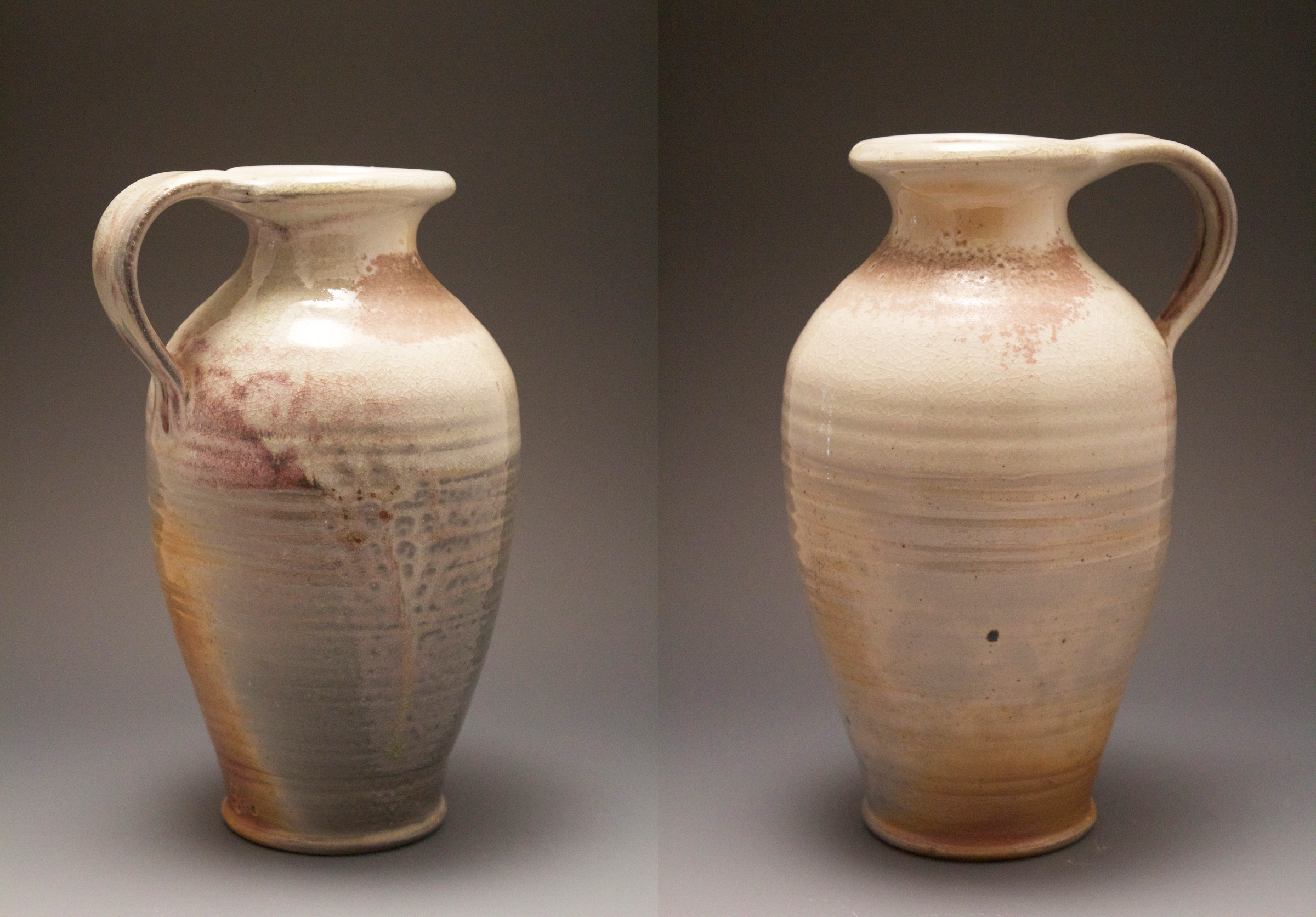 01 single handle jug Published August 11, 2020 at 2400 × 1672 in 01 single handle jug 4.5″w x 8″h This jug is made from stoneware that is wood fired with an shino glaze. This simple jug shows some of the elegant variations that this glaze can provide and the lower half is resulting from the natural ash deposits from the kiln. $85