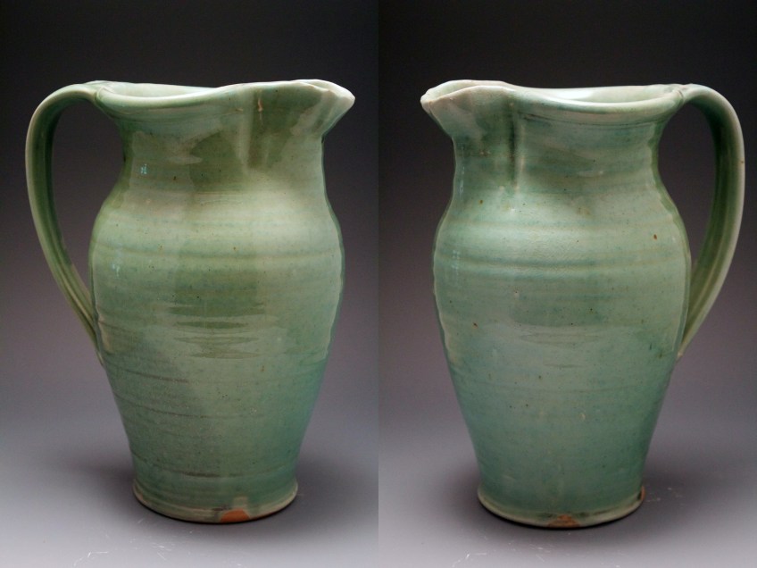 03 pitcher Published August 11, 2020 at 2400 × 1800 in 03 pitcher 5″w x 9″h This pitcher is made from stoneware that is wood fired with an oribe glaze. This simple pitcher shows some of the elegant variations that this glaze can provide. $75