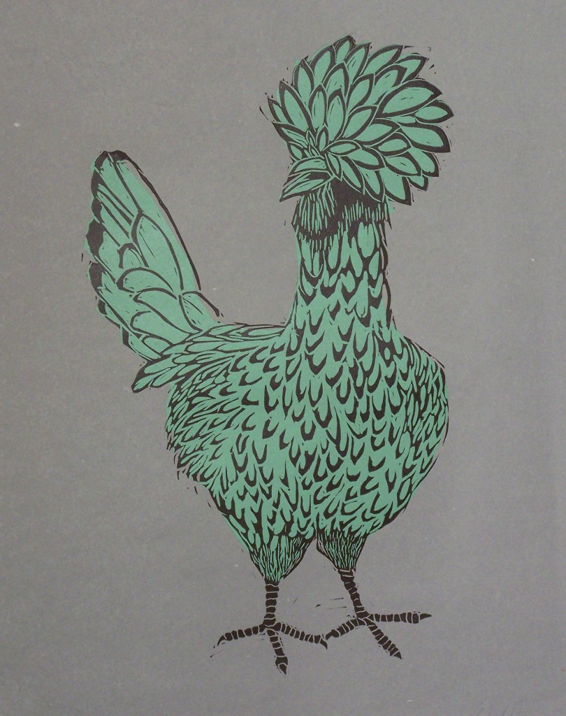 chicken #10 Published July 23, 2016 at 1799 × 2275 in chicken #10 16″ x 20″ ink on handmade cotton rag, linocut