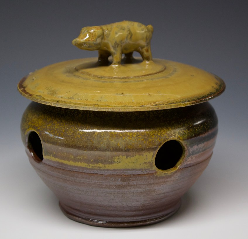 119 garlic jar with pig handle Published October 16, 2020 at 3252 × 3145 in 119 garlic jar with pig handle SOLD 4″ x 5″ Temoku with thistle ash glaze. Thistle is gathered burned and the ash is made into a glaze giving this jar a regional flair. fits about half pound of garlic. $45