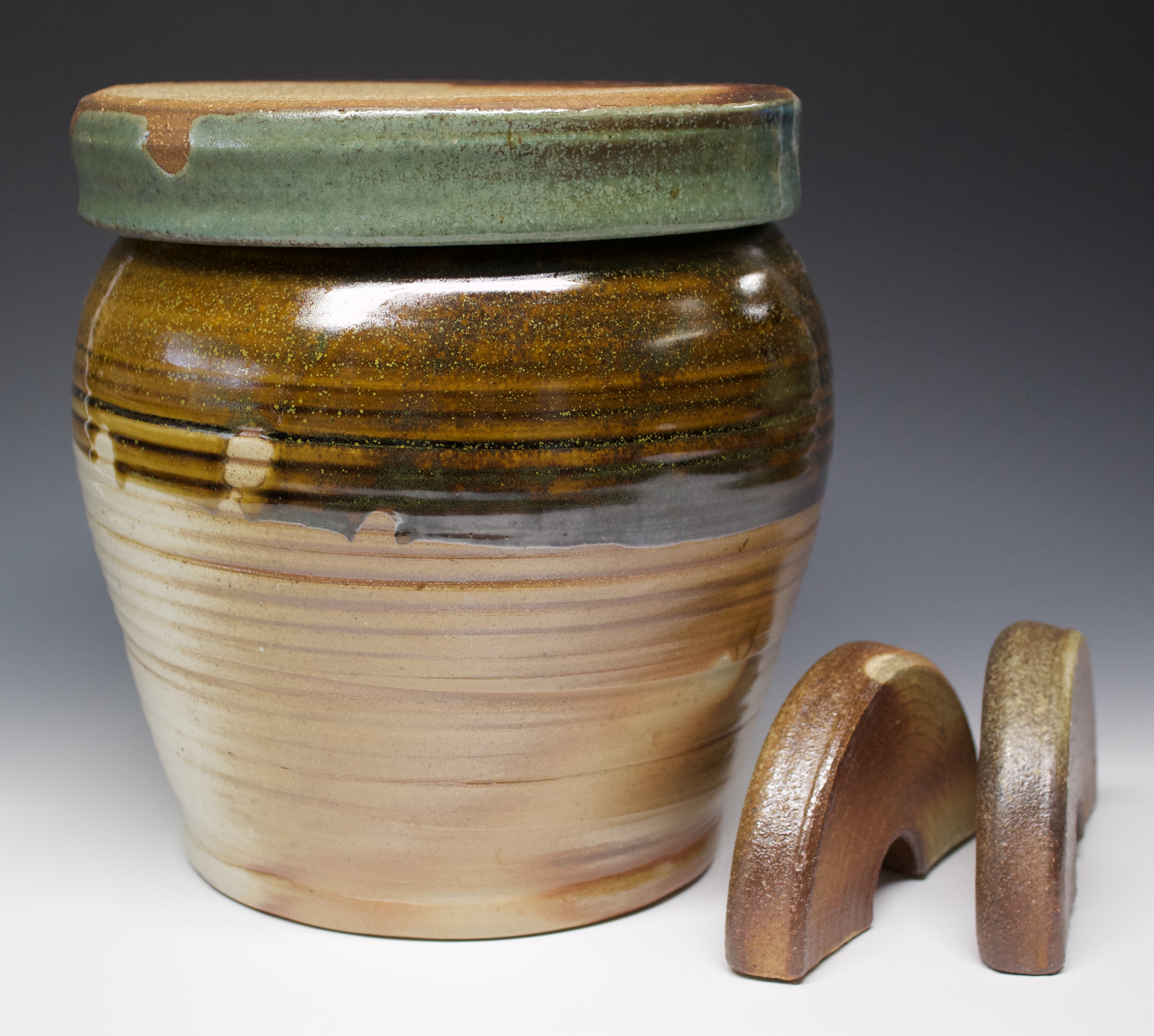160 fermentation jar #1 Published October 16, 2020 at 3489 × 3133 in 160 fermentation jar #1 SOLD 9″ x 9″ #1 has a lid with an oribe glaze and the jar has a temoku glaze. holds 5 – 6 quarts $245