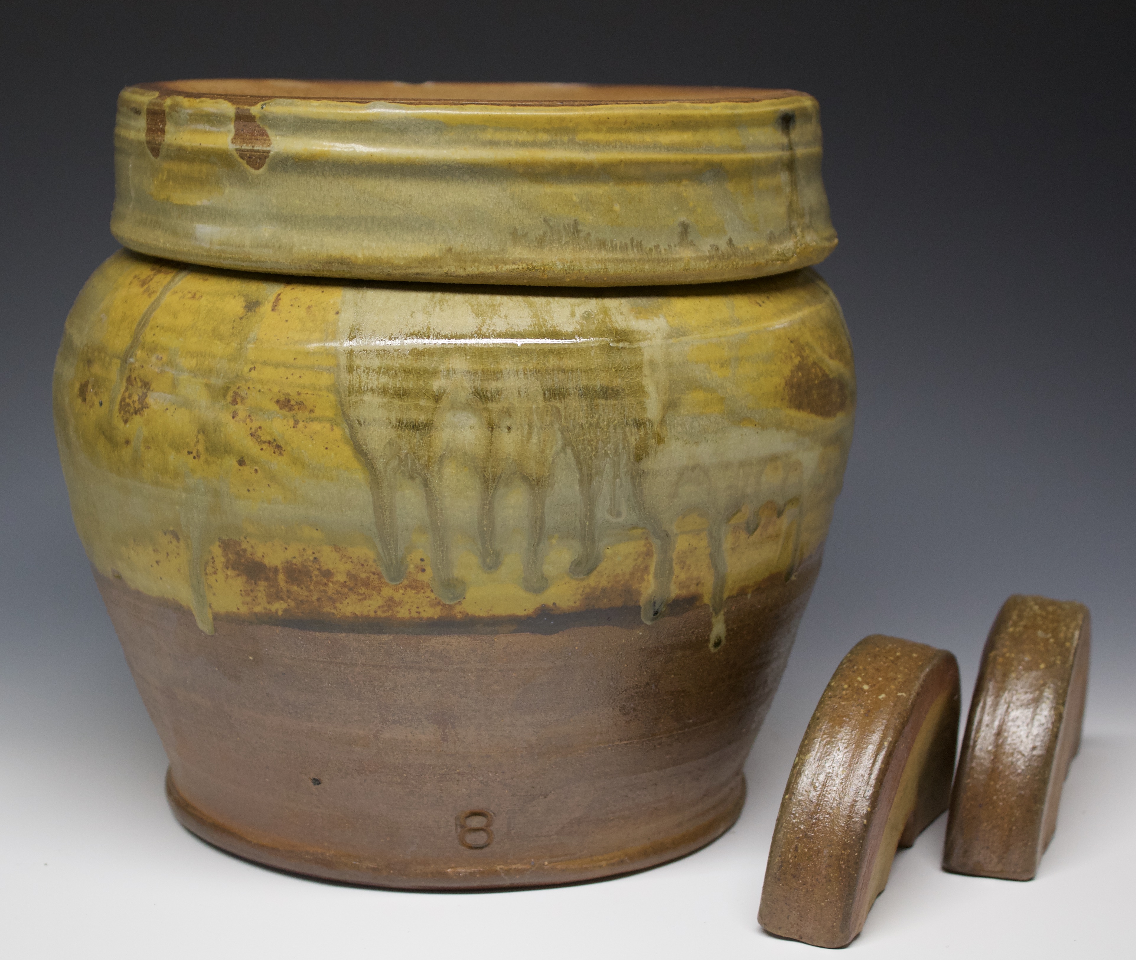 #8 is half glazed with my own glaze and a thistle ash glaze. The thistle was collected in a field that is in transition to organic. The rest of the jar as well as the weights are glazed by natural fly ash occuring in the kiln.