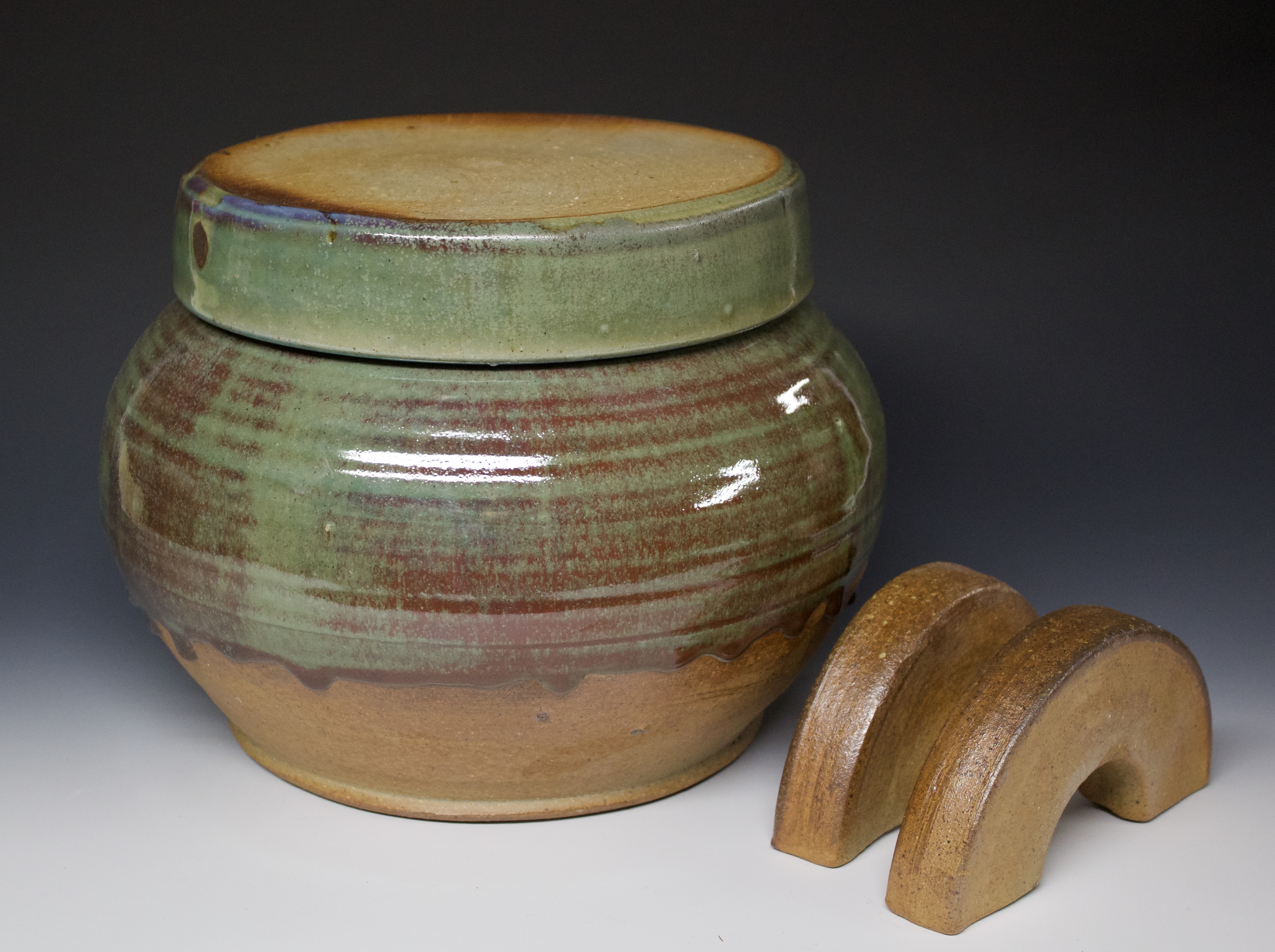 163A fermentation jar Published December 8, 2020 at 4378 × 3270 in 163A fermentation jar 163A fermentation jar this fermentation jar is glazed with an oribe glaze and marked with #15 in the series I have been making. It holds between 5 to 6 quarts. comes with weights to hold your fermenting veggies under the brine. $245