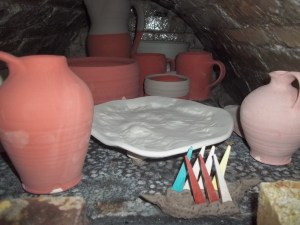 Jon has just lit the 2nd firing. Below a glimpse of the very top shelf before the door bricks were set. The triangle cones in the front are temperature gauges. Jon will be able to peek through a brick hole to watch the temperature rise throughout the firing.