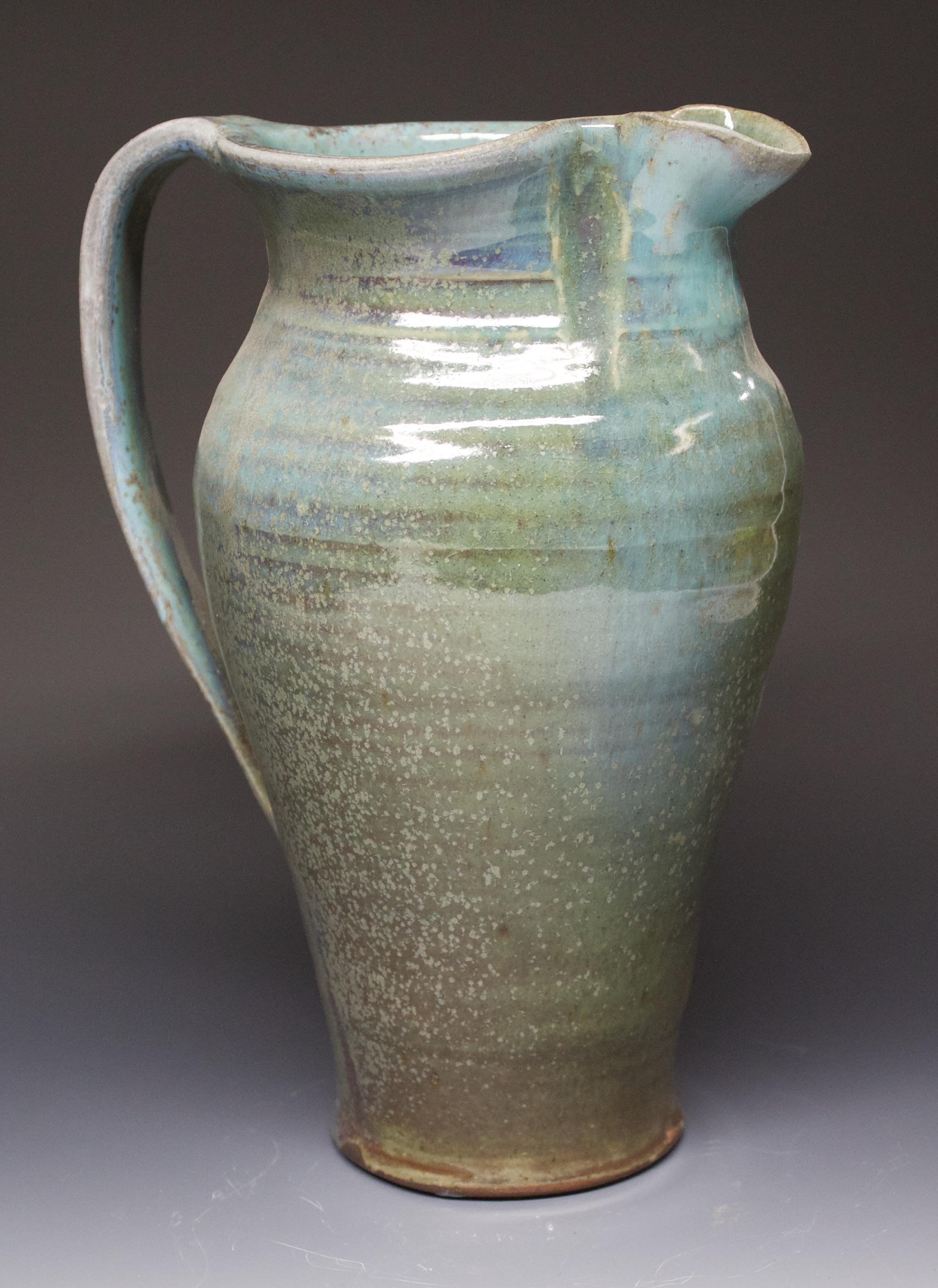 309 pitcher Published October 28, 2020 at 2453 × 3369 in 309 pitcher 5.5″ x 9.5″ oribe glaze with a natural variation to light blue result from the wood fire process. 1.75 quarts $70