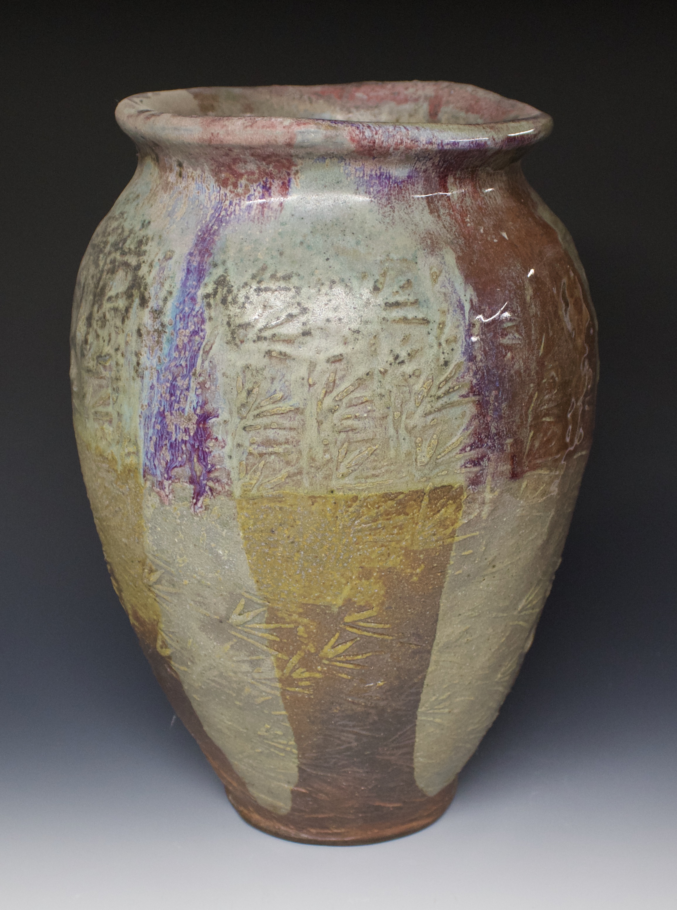 523 large vase Published December 8, 2020 at 2311 × 3106 in 523 large vase 8″ x 8″ x 13″ the upper glazed area is an oribe glaze with a red glaze poured over. the lower part is result of the unglazed clay surface exposed to the atmosphere of the wood fired kiln. $350