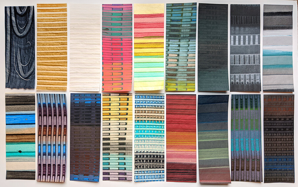 Moon, Cubed, Red Gold Grill, Squares are magical. All of these papers are cotton rag, internally sized, and pigmented. These are 100% paper fiber and are not printed. They use unique stenciling or hand/fiber manipulation techniques to create the designs. The color on top of each sheet (2 for cubed) is pigmented paper pulp. The cotton is a byproduct from the clothing industry.