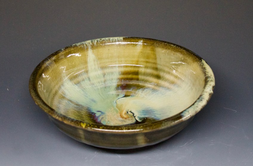 06 Bowl Published November 11, 2021 at 3282 × 2160 in 06 Bowl SOLD 06 Bowl $75 An amazing woodfired bowl with a Celadon, a deep transparent green and a poured splash of thistle ash glaze from our farm and the creamy center. 2″ x 7.5″