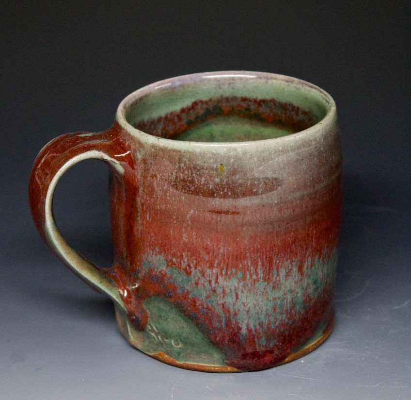12 mug Published November 11, 2021 at 3206 × 3117 in 12 mug $40 The woodfired mug is glazed with Oribe, a green glaze with Jon’s red over the top. 4″ x 3.5″