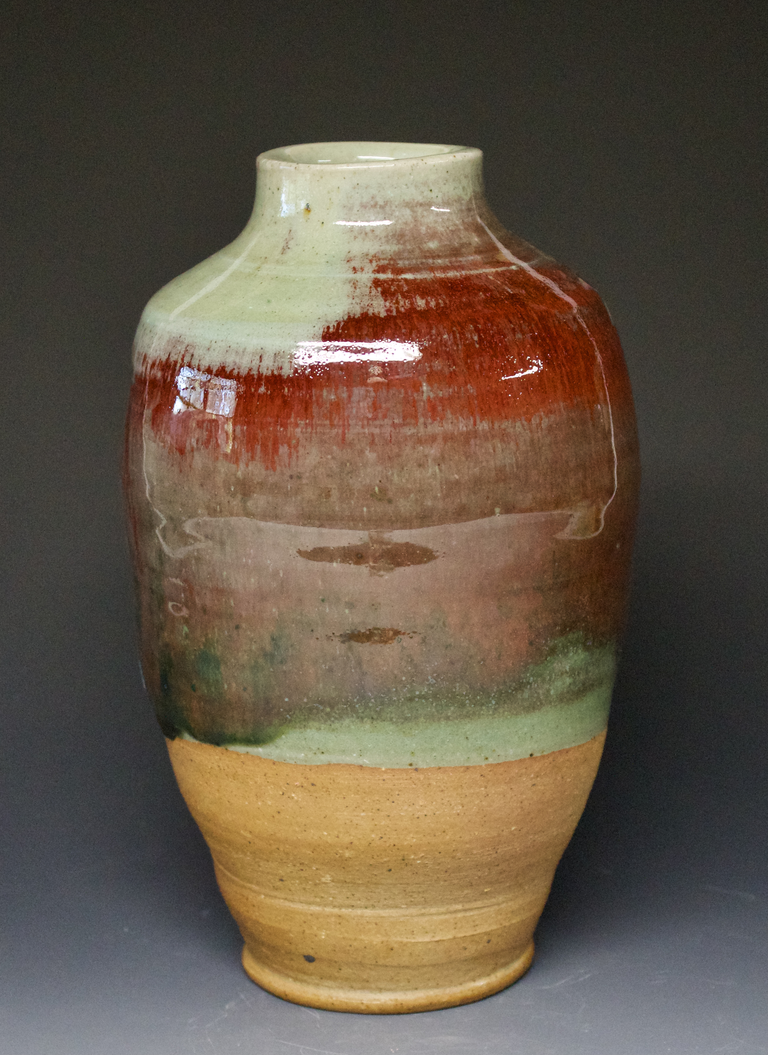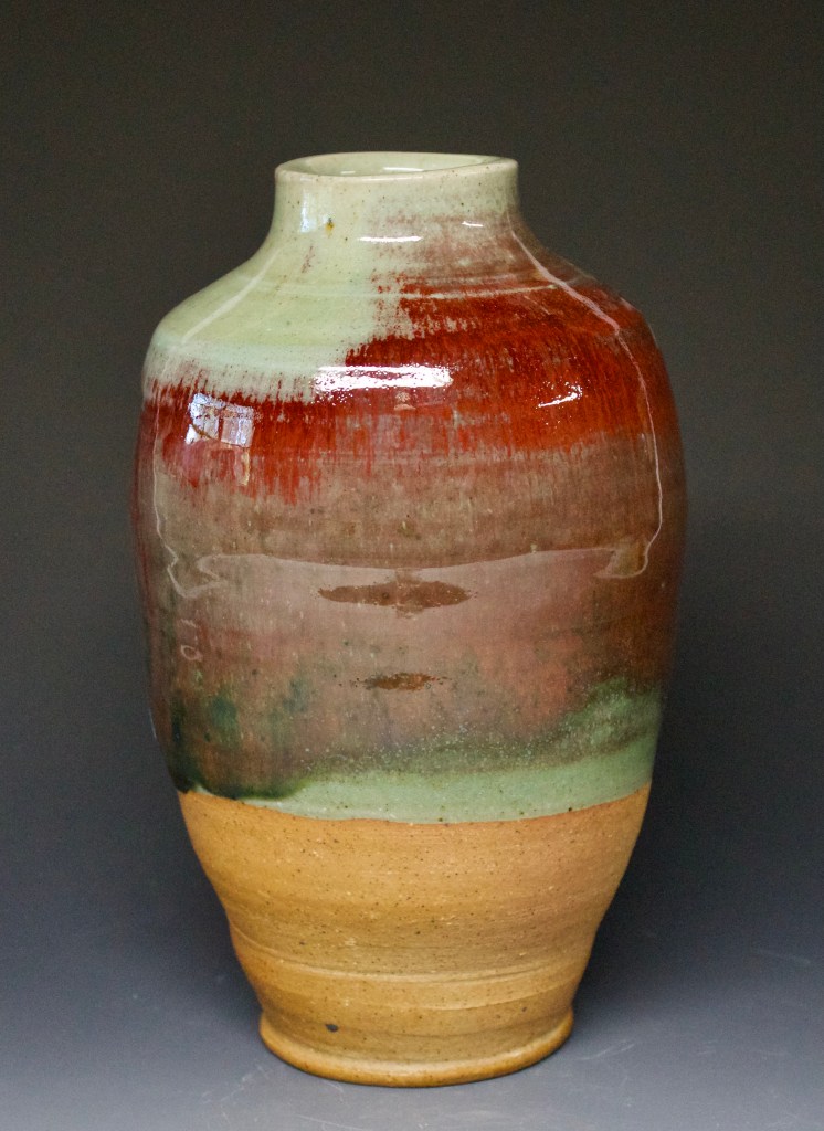 22 vase Published November 11, 2021 at 2519 × 3459 in 22 vase 22 vase $100 A woodfired vase with Oribe’ and Jon’s red glaze mixing on the surface during the firing process. 9″ x 5″