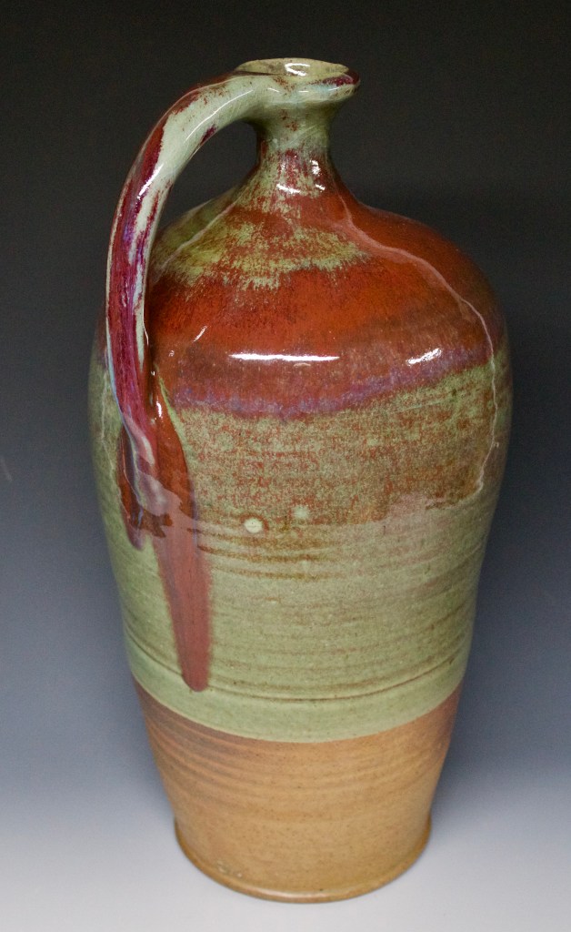 30 bottle Published November 11, 2021 at 2714 × 4421 in 30 bottle $250 Extremely unique work from the kiln. Wood fired handled bottle. Oribe green glaze with Jon’s red glaze over top – very bottom exposed to natural ash deposit. 15″ x 7″