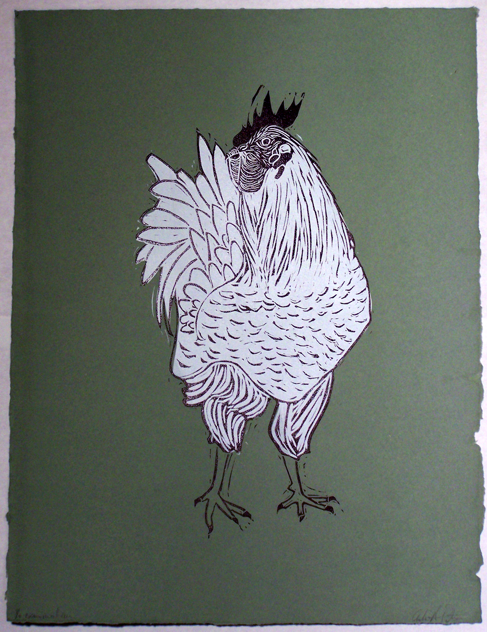 chicken #4 Published July 23, 2016 at 1872 × 2430 in chicken #4 18″ x 24″ ink on handmade cotton rag, linocut